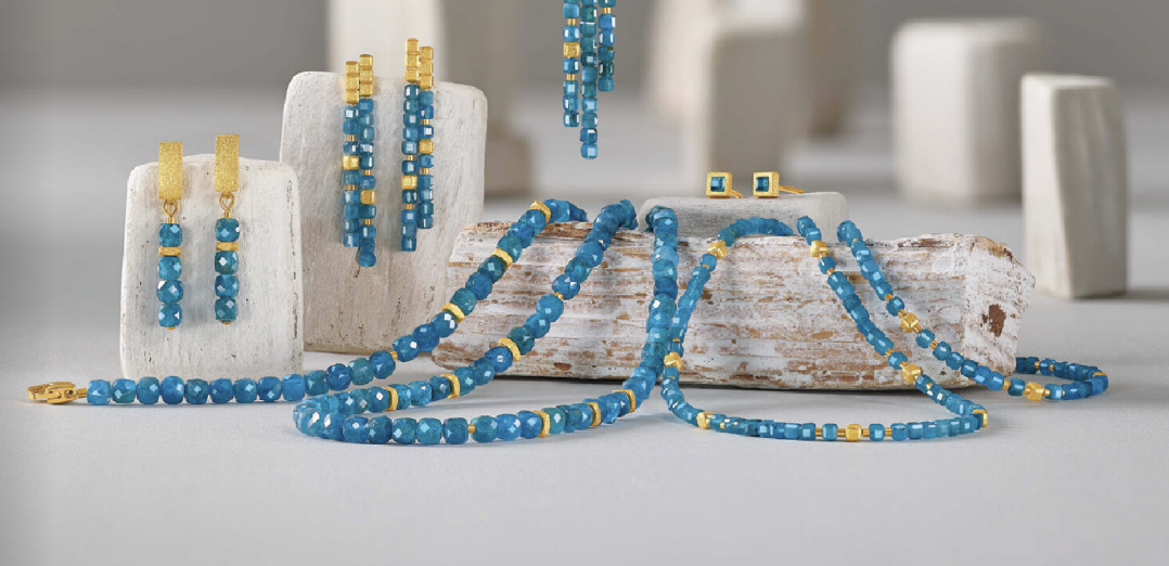 The apatite used in the Bernd Wolf manufactory captivates with its exceptional petrol-blue color and fascinating brilliance, evoking positive associations instantly. Apatite occurs in various hues, from intense blue and soft green to bright yellow. The striking blue, especially popular in jewelry, is created by the presence of iron and manganese.